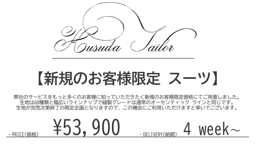 神戸 オーダースーツ・シャツ | Kusuda Tailor [クスダ テーラー] ※新規のお客様限定特別価格でご案内のお知らせ 当店ベーシックラインのスーツの販売価格は2P 74,800円(税込)~ですが 初めてご来店いただくお客様より「もう少し安い仕立て生地があれば…」とゆうお声をいただきましたので 当店をご利用になられたことのないお客様 […]