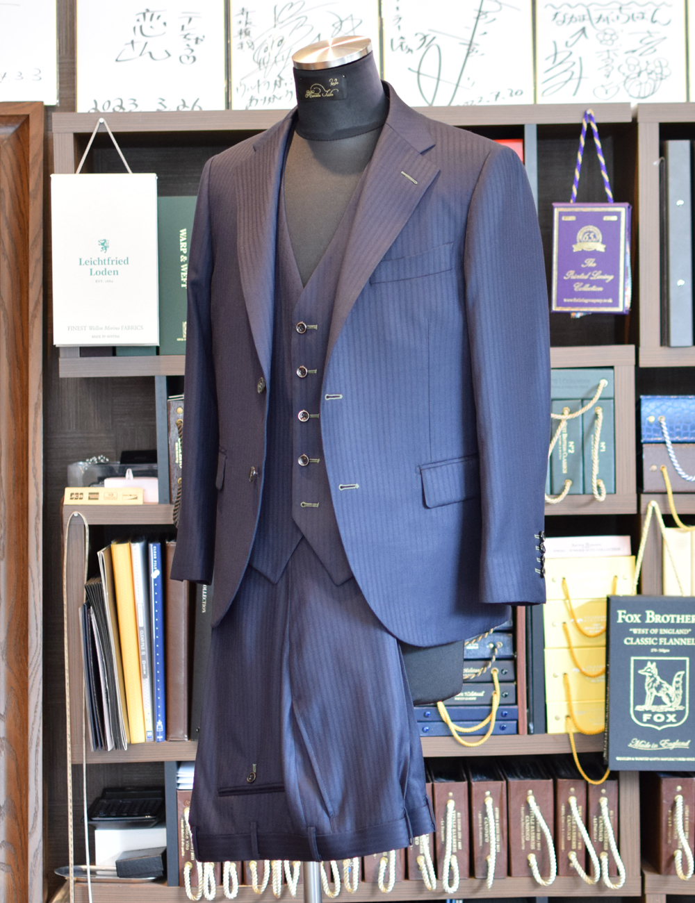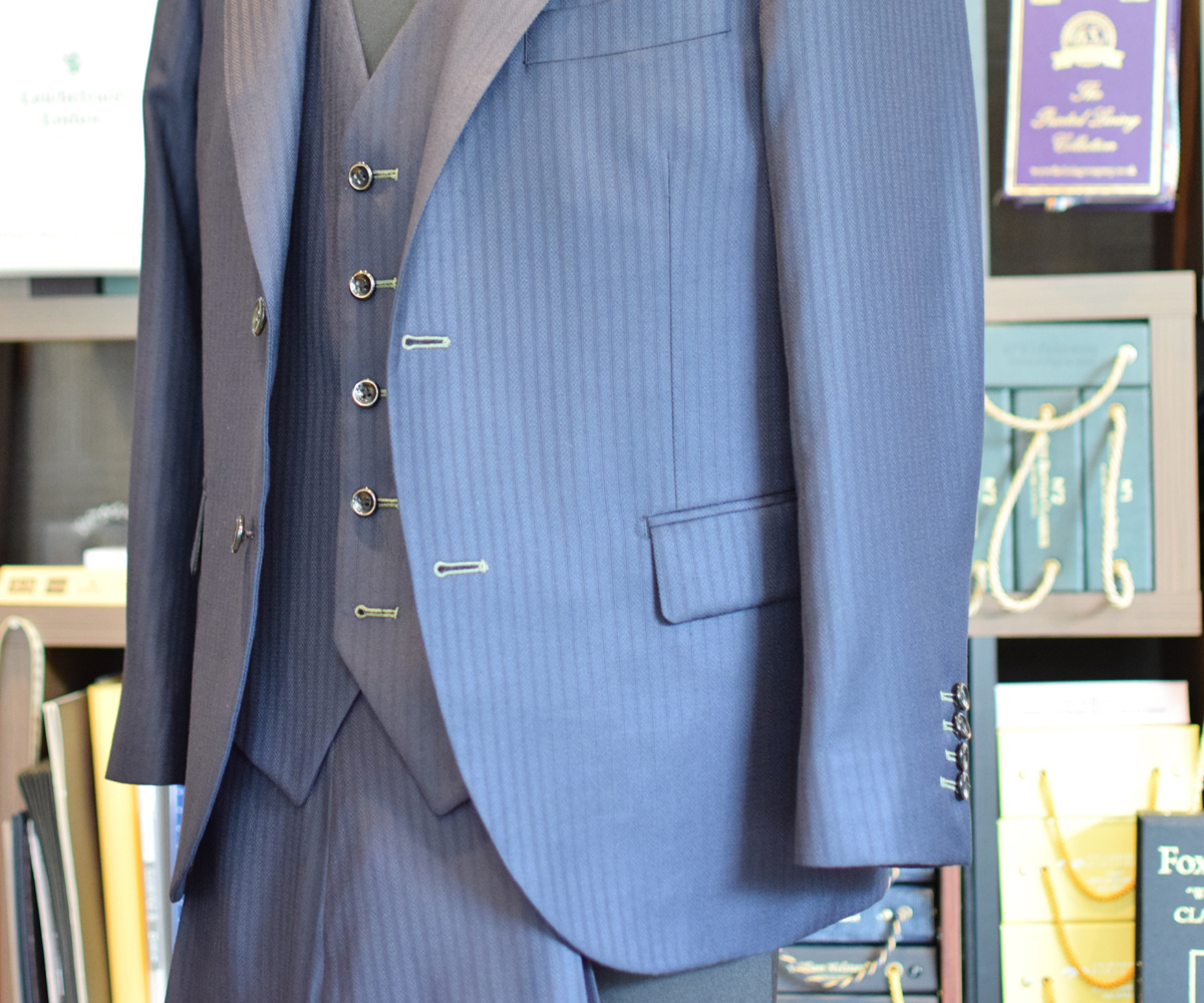 織柄でストライプと格子の入ったオリジナリティある生地で仕立てさせていただいた3P