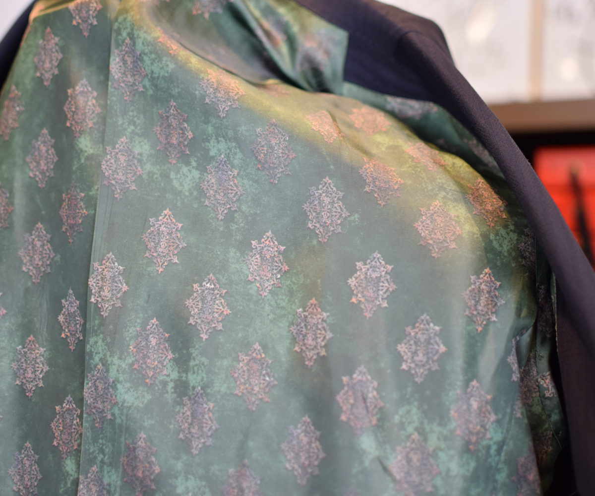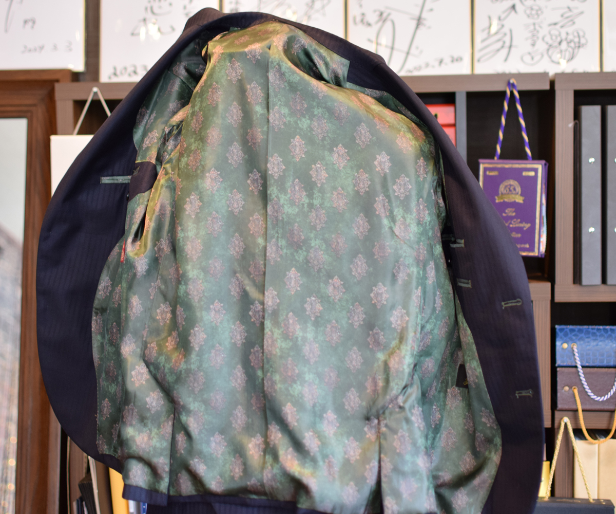 釦ホールカラーと裏地のグリーンは顧客様のイメージカラーで今まで統一していただいております。
