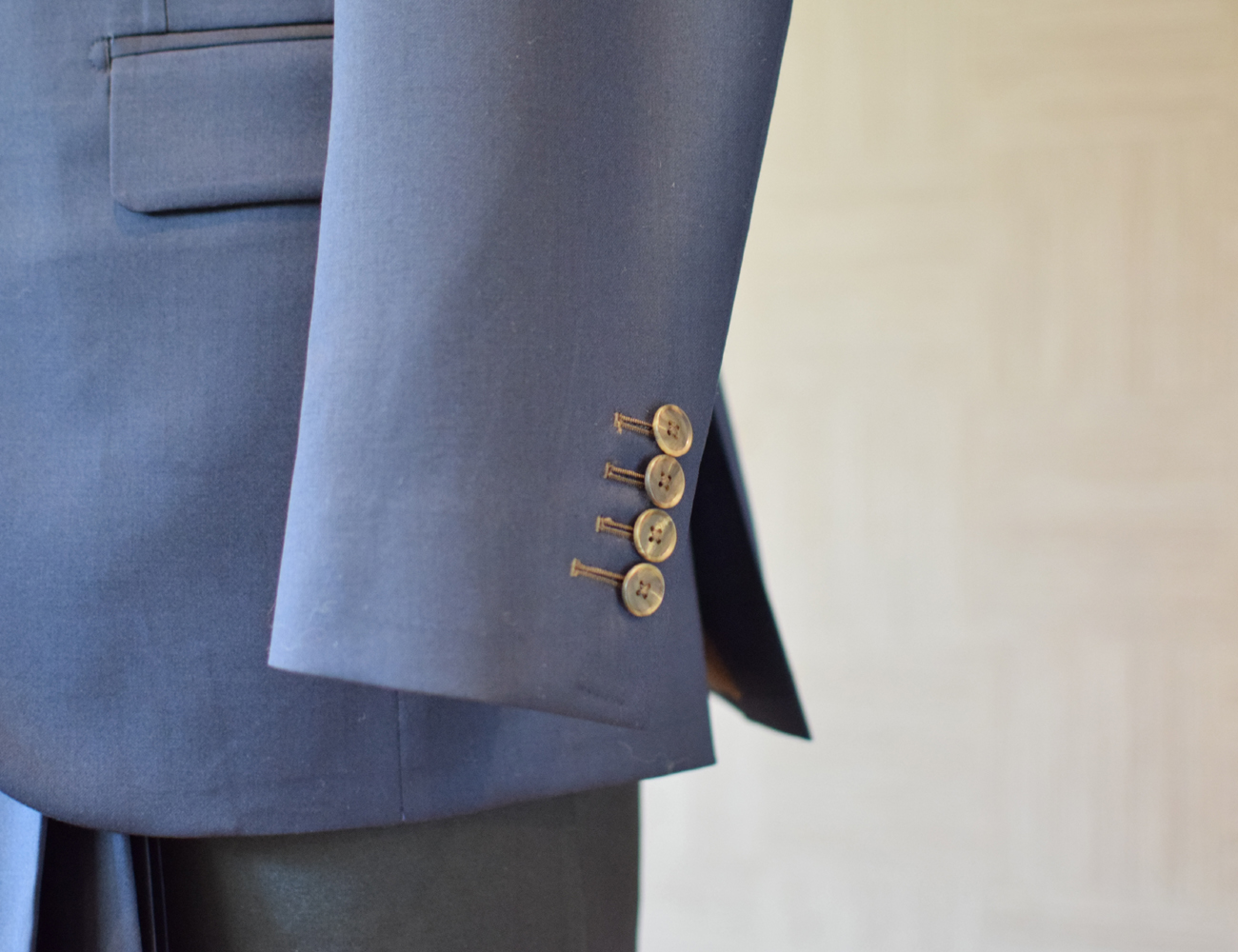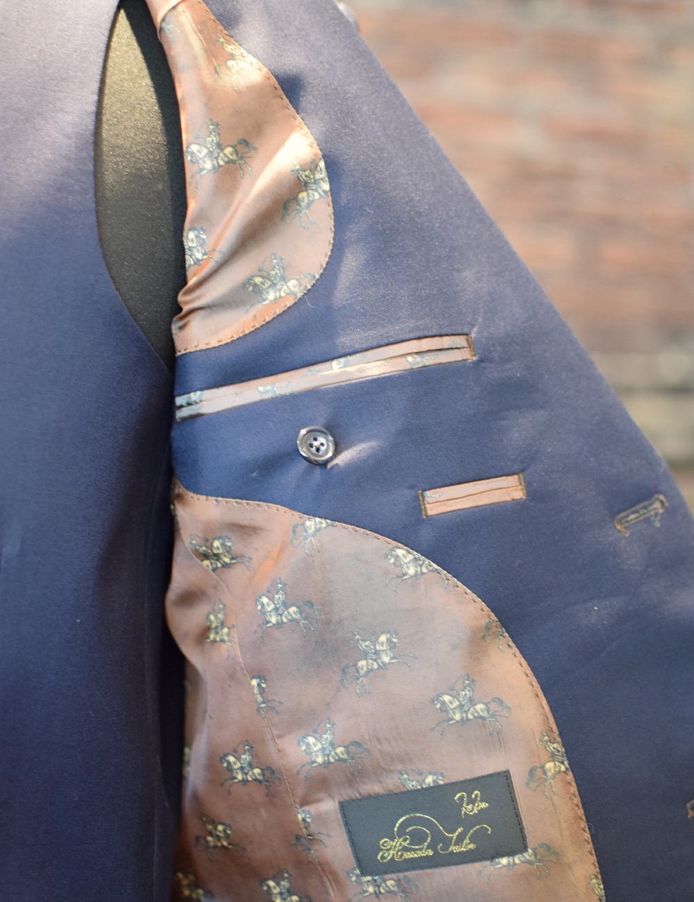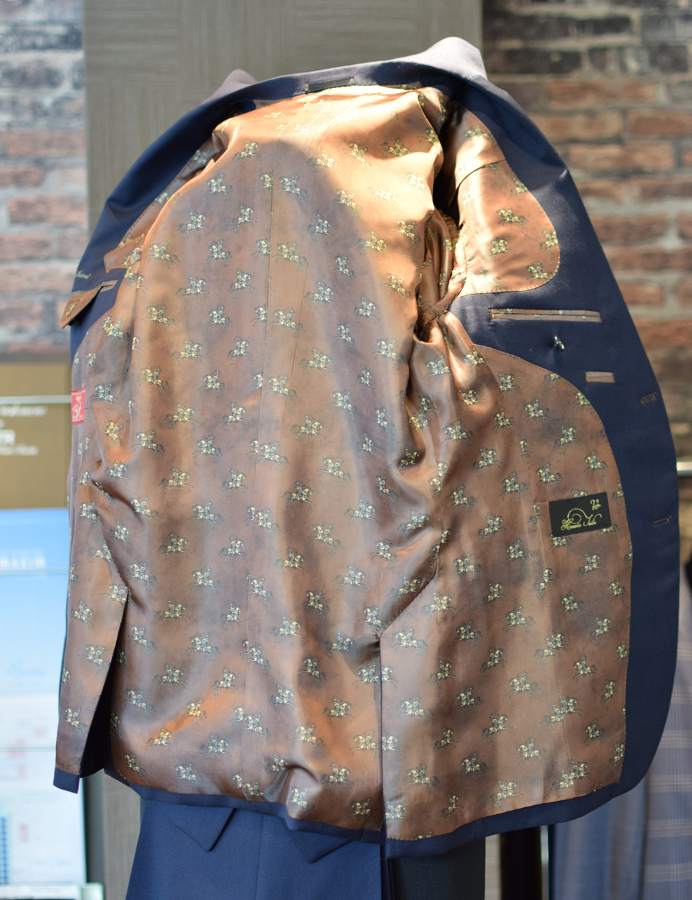 紺地に釦穴色と裏地をブラウンのアズーロエマローネで纏まりのある色使いです。